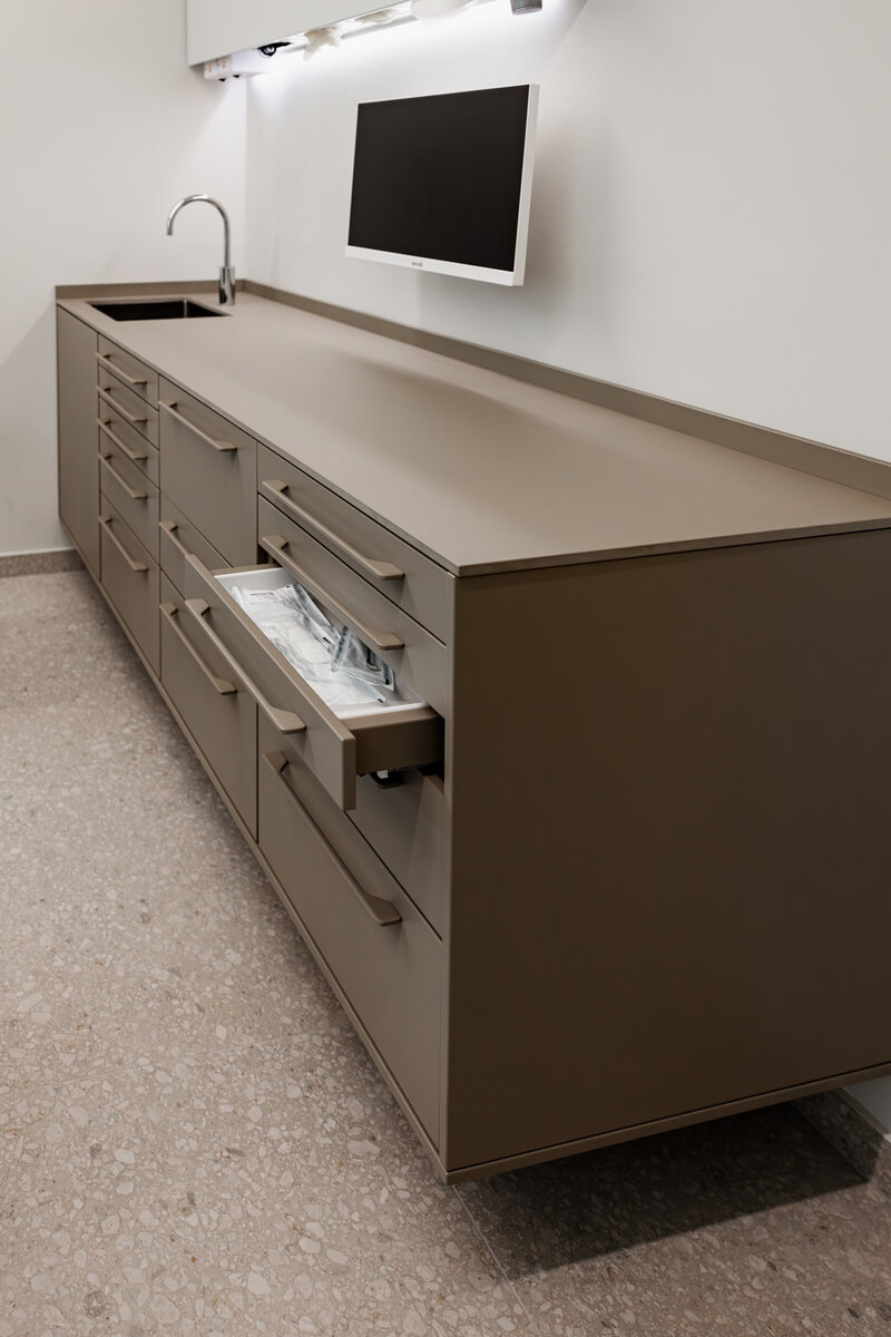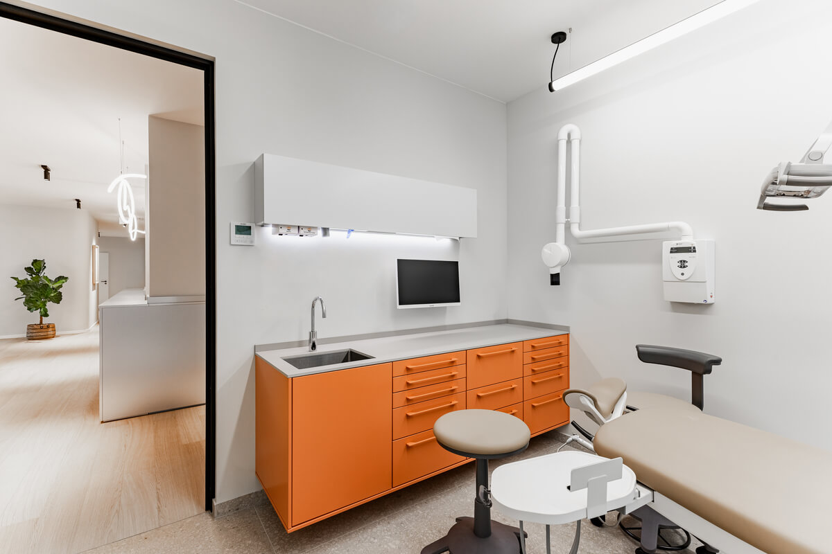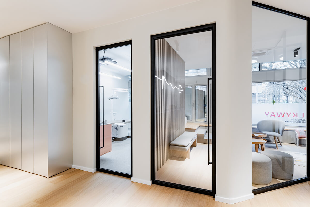 Das Designkonzept basiert auf einem präzisen Zusammenspiel aus warmem Holz, puristischen Betonoberflächen und Glas. Maßgefertigte Einbauten – wie die architektonisch integrierte Sitznische mit Holzlamellen im Kinderbereich – sowie eine gezielte Lichtführung strukturieren den Raum und schaffen eine reduzierte, zugleich geborgene Atmosphäre. Ergänzt wird das anspruchsvolle Raumprogramm durch eine Zahnputzschule, ein eigenes Labor sowie hocheffiziente Backoffice- und Mitarbeiterbereiche. Das Ergebnis ist eine architektonische Einheit, die medizinische Funktionalität, hochwertige Materialität und ein erstklassiges Patientenerlebnis harmonisch miteinander verknüpft.