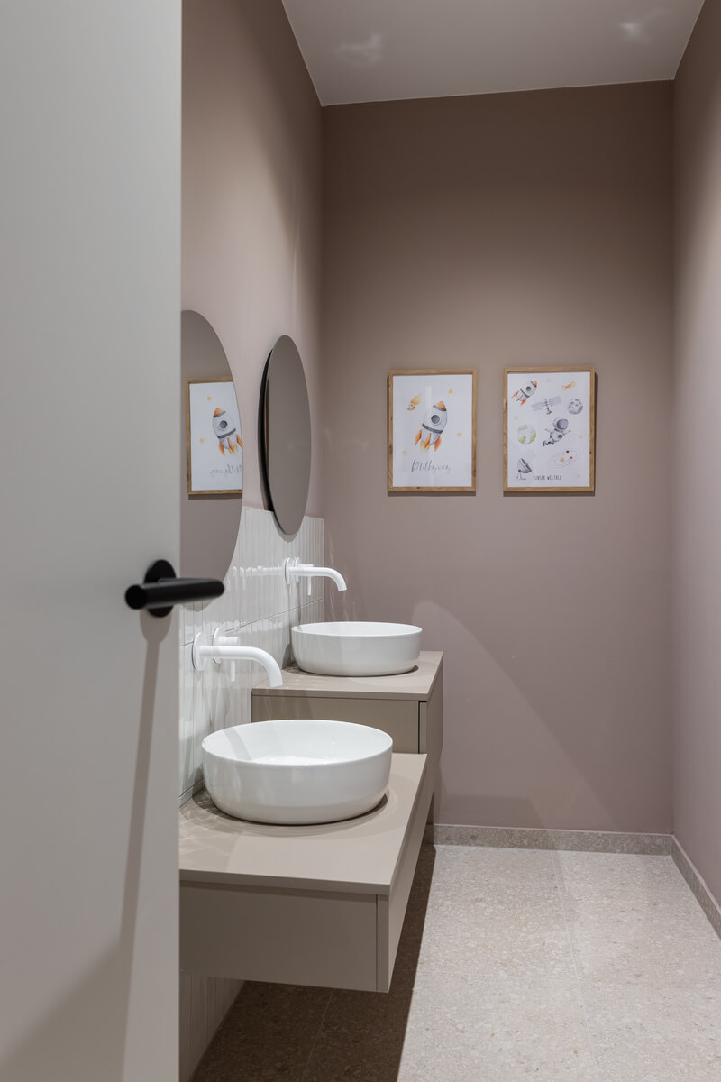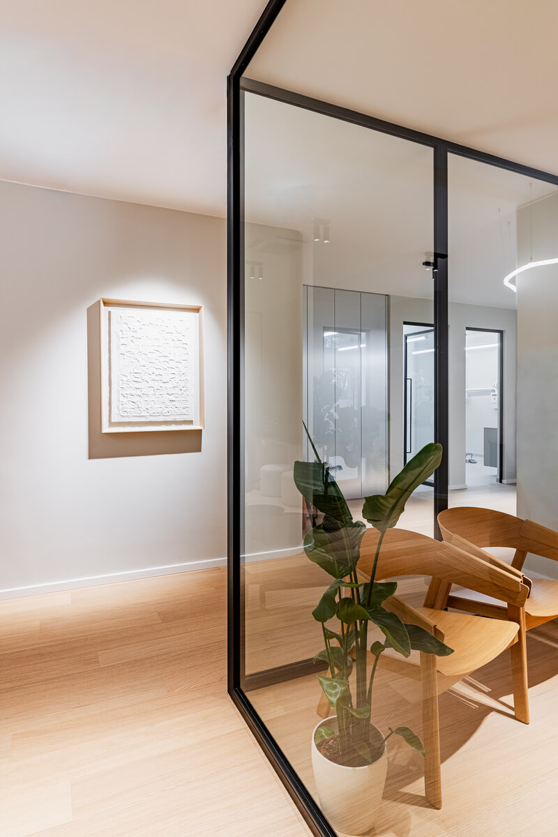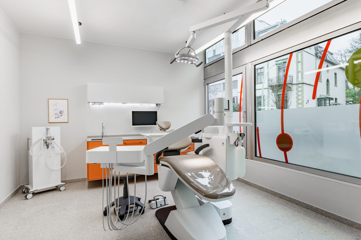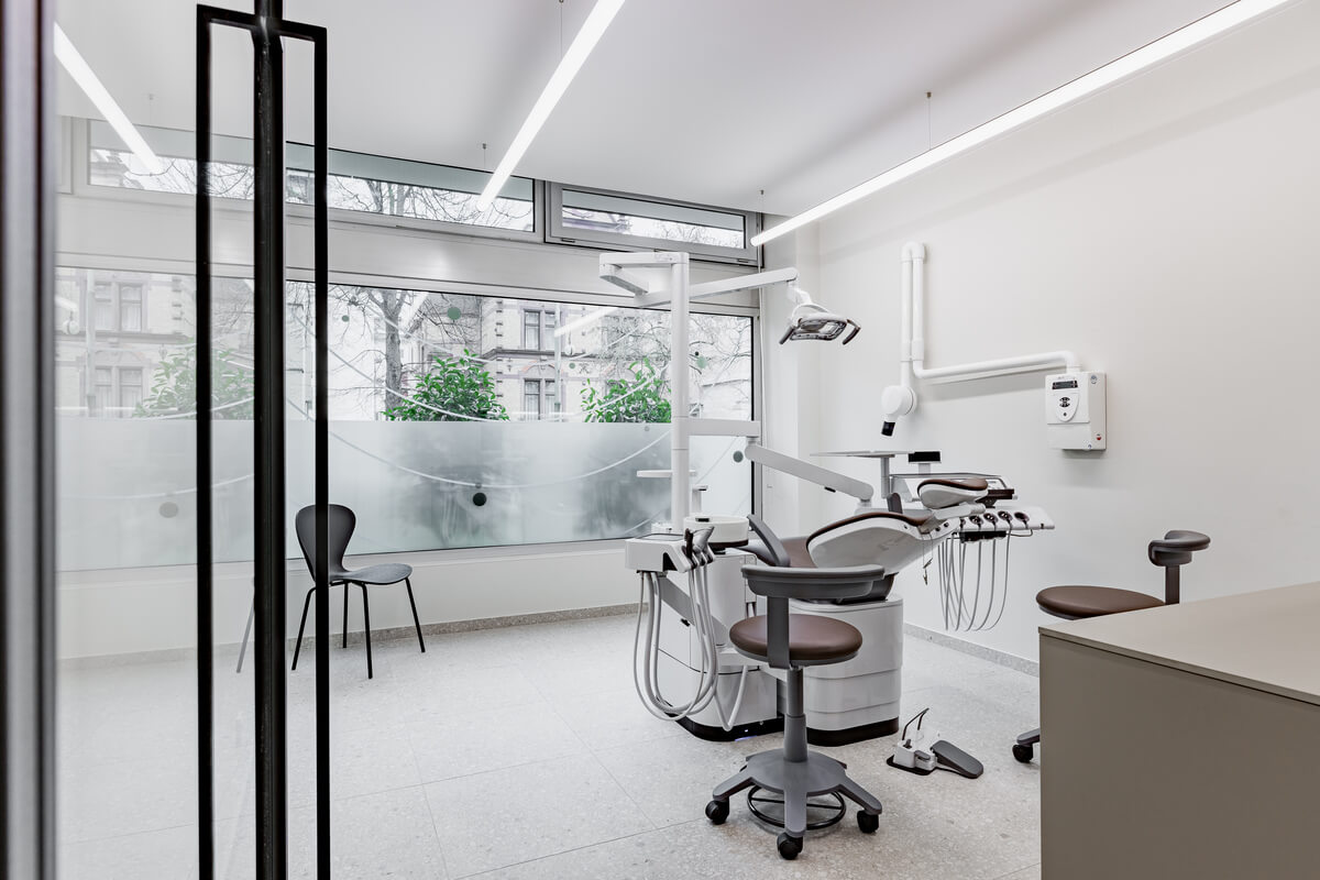 Das Designkonzept basiert auf einem präzisen Zusammenspiel aus warmem Holz, puristischen Betonoberflächen und Glas. Maßgefertigte Einbauten – wie die architektonisch integrierte Sitznische mit Holzlamellen im Kinderbereich – sowie eine gezielte Lichtführung strukturieren den Raum und schaffen eine reduzierte, zugleich geborgene Atmosphäre. Ergänzt wird das anspruchsvolle Raumprogramm durch eine Zahnputzschule, ein eigenes Labor sowie hocheffiziente Backoffice- und Mitarbeiterbereiche. Das Ergebnis ist eine architektonische Einheit, die medizinische Funktionalität, hochwertige Materialität und ein erstklassiges Patientenerlebnis harmonisch miteinander verknüpft.