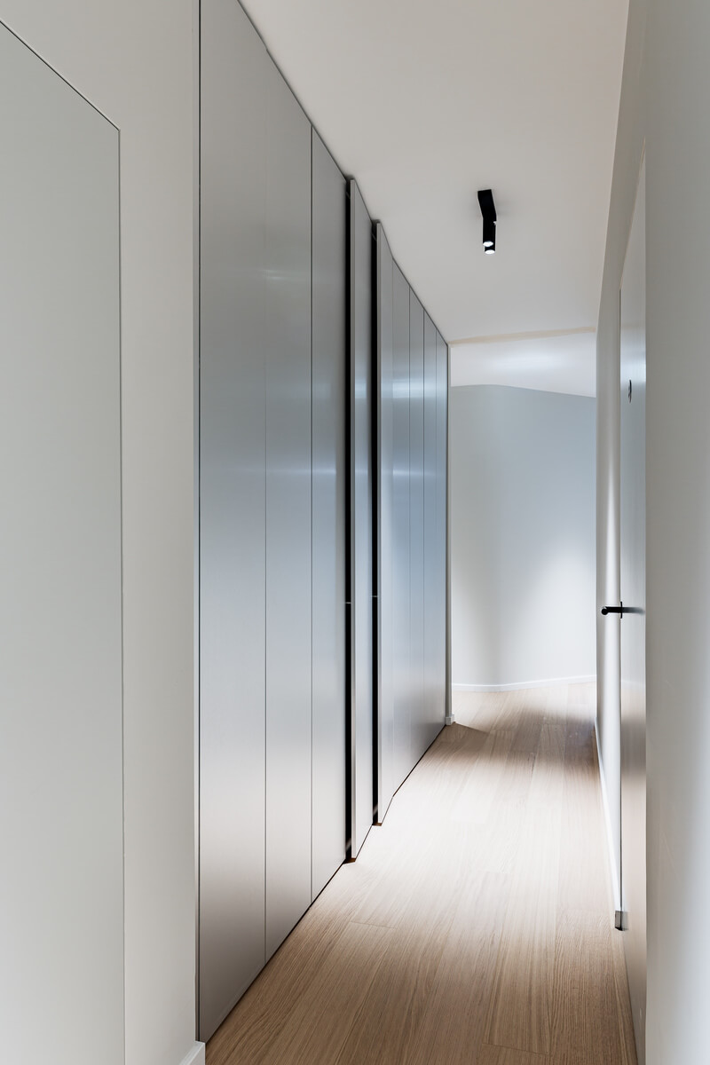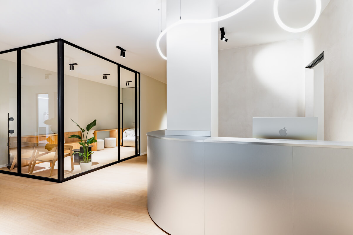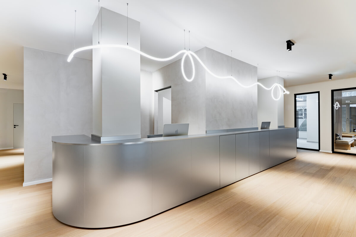 Eine differenzierte Zonierung gliedert die Fläche in öffentliche, halböffentliche und interne Bereiche und schafft eine intuitive Orientierung innerhalb der Praxis. Der Empfangsbereich bildet mit seinem skulpturalen, geschwungenen Tresen in Edelstahloptik und einer fließenden Lichtskulptur den zentralen Auftakt. Von hier aus erschließen sich die spezialisierten Wartebereiche sowie insgesamt acht Behandlungsräume, die sich jeweils hälftig der modernen Zahnmedizin für Erwachsene und Kinder widmen, ergänzt durch Prophylaxeräume und einen dedizierten Eingriffsbereich mit Aufwachraum.