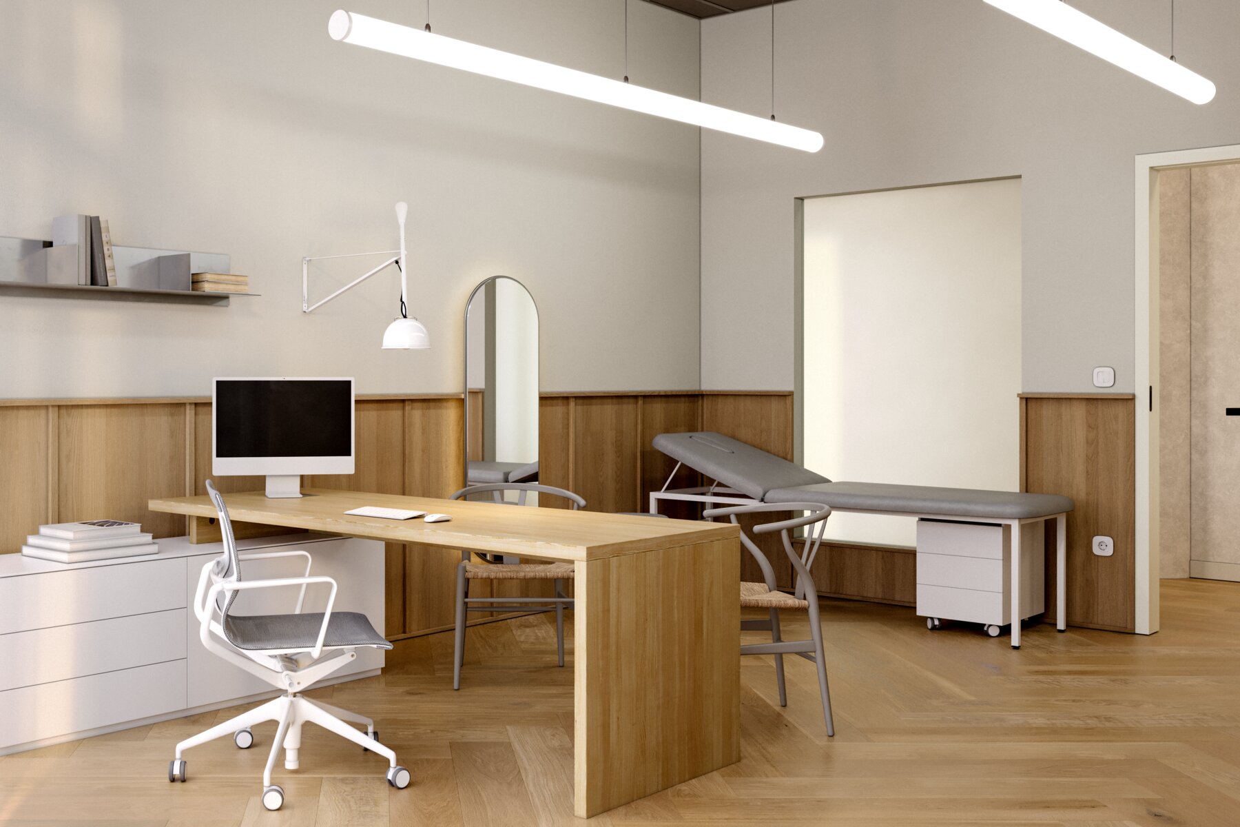 Ein wesentlicher Fokus lag auf der Entwicklung einer ganzheitlichen, patientenzentrierten Journey – vom ersten Ankommen über den Empfangsprozess bis hin zum Arztgespräch. Durch die Analyse bestehender Raumstrukturen, die Beobachtung der täglichen Praxisabläufe sowie die enge Abstimmung mit dem Team vor Ort wurden Optimierungspotenziale identifiziert und in eine klare räumliche Leitidee überführt.
